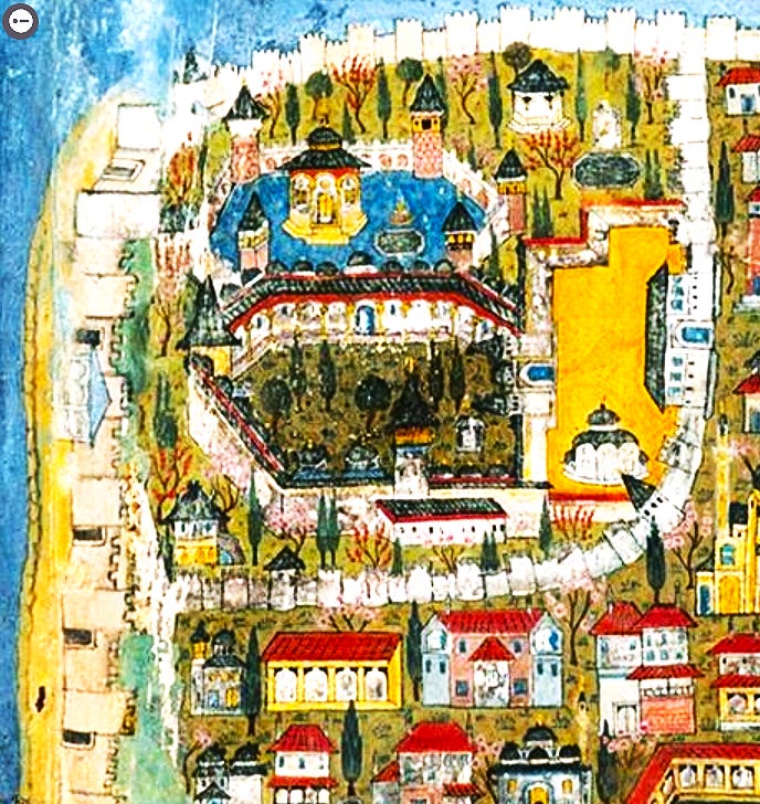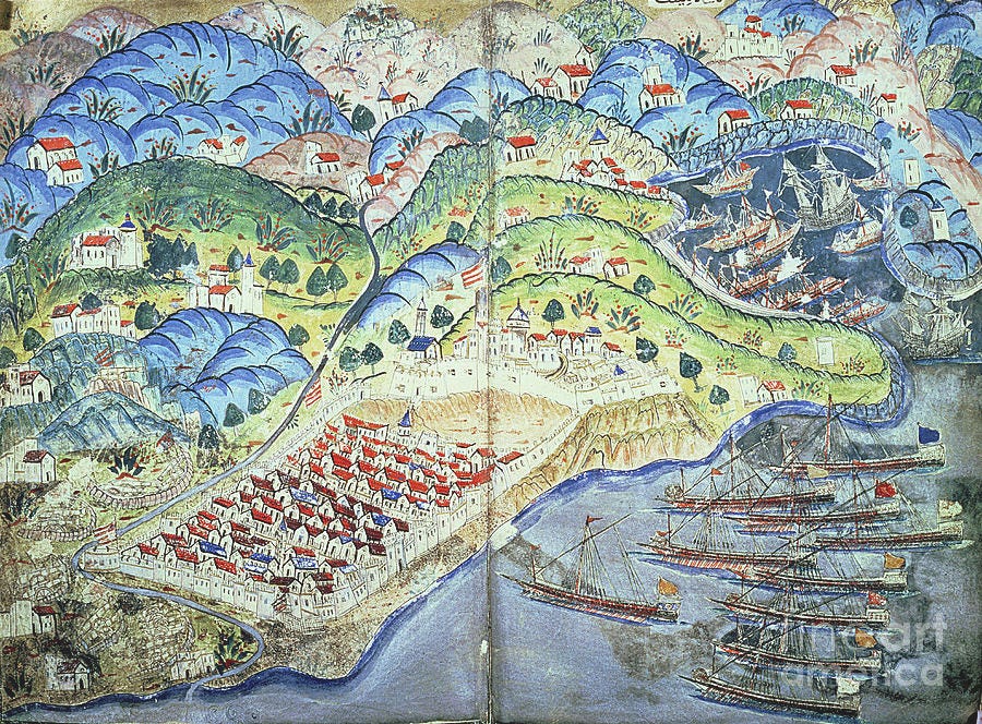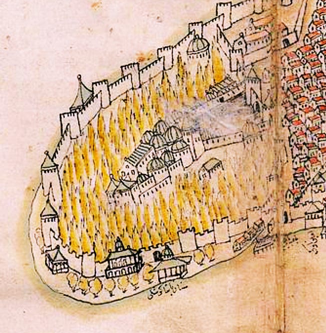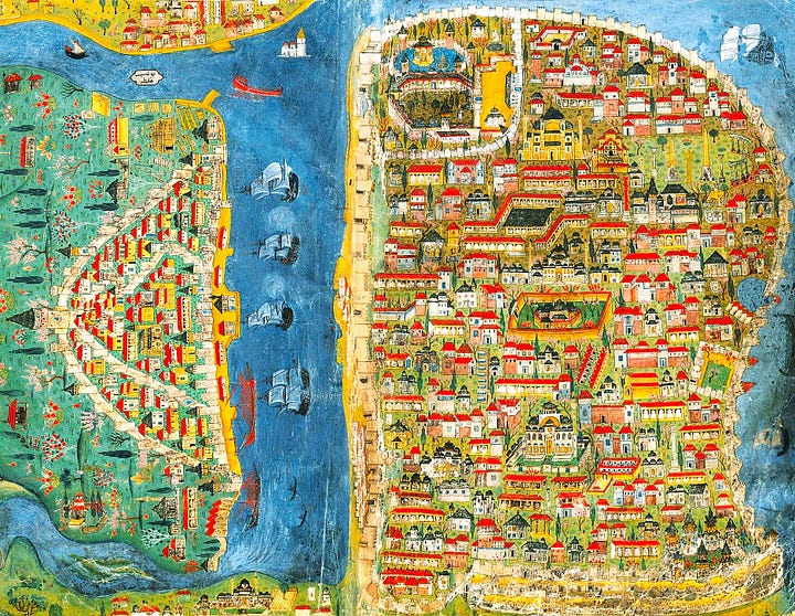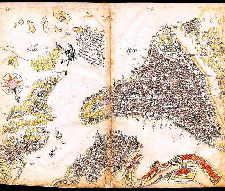 Ma il suo capolavoro è senz’altro la capitale imperiale, Costantinopoli: bellissima ma non proprio precisa, un po' squadrata, con prospettiva mutevole - ossia girando l’immagine alcuni elementi sono visibili di fronte, altri no. Sulla metropoli si cimentò anche il suo “rivale” Piri Reìs - a confronto qui sotto.