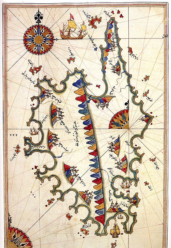 Piri, al contrario, era uomo di mare: nato nel 1470 sulle rive turche dell'Egeo, entrò subito nella flotta imperiale grazie allo zio Kemal, che era ammiraglio e corsaro. Conosceva il Mediterraneo come la sua vasca da bagno, e a trent’anni s’era fatto già due battaglie di Lepanto (anche se la più famosa sarebbe arrivata dopo). Come ogni reduce, passava il tempo a rimuginare sulla guerra conclusa; a un certo punto decise che all’Impero mancava qualcosa.