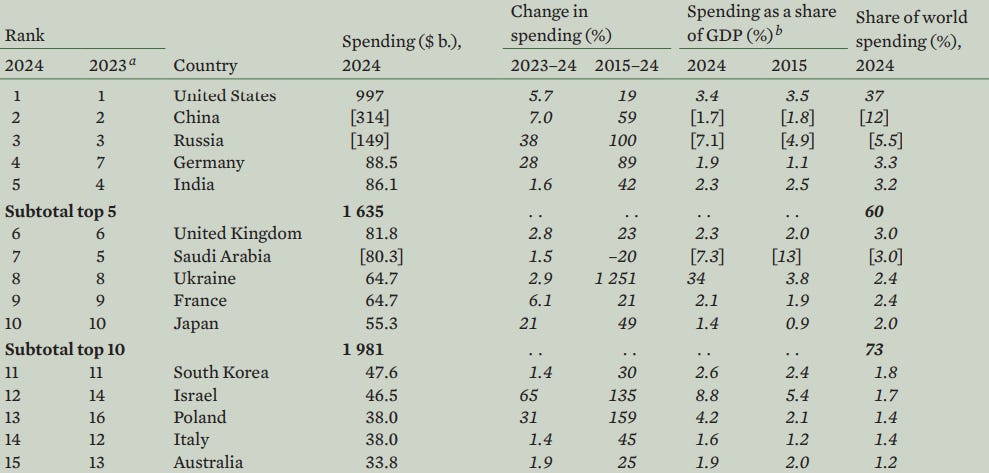 1) Le spese militari. Gli Stati Uniti guidano la classifica assoluta delle spese militari al mondo: hanno sfiorato i 1000 miliardi di dollari nel 2024 - il 20% in più di dieci anni fa. A distanza abissale, seconda è la Cina, con 314. Israele, da parte sua, guida la classifica relativa: spende il 9% del suo pil in armi (e a noi fa impressione il 5. O il 2!) - nessuno, con l’esclusione dell’Ucraina invasa. Inoltre, per spesa in proporzione agli abitanti, batte anche l’Ucraina, e doppia gli Stati Uniti. In confronto a dieci anni fa, Israele spende in armamenti il 135% in più!