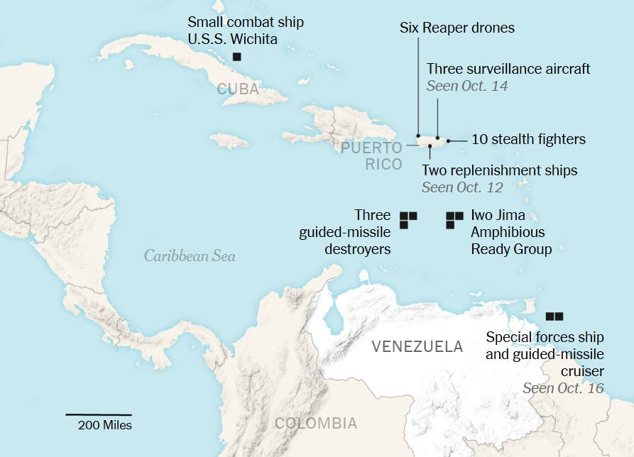Nel caso del Venezuela, ventilato come opzione concreta e imminente: parte della flotta americana, ossia il dispositivo militare marittimo più grande del mondo, si sta raccogliendo davanti alle coste del Paese caraibico, e ha attaccato navigli di piccola taglia (i morti civili sono per ora qualche decina).