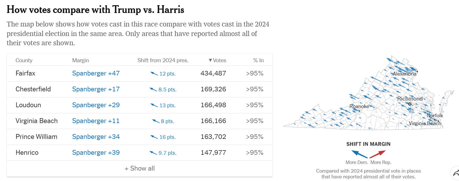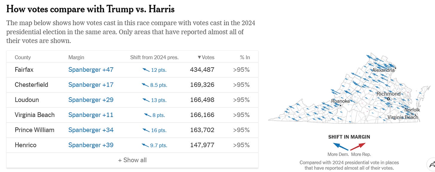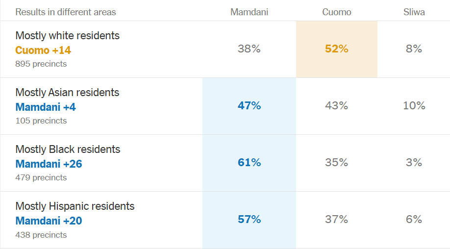 Vittoria, la sua, né larghissima (+9), né generalizzata. Ad esempio, nei quartieri a maggioranza bianca ha vinto Cuomo, in media con un distacco di 14 punti. Ma New York fa eccezione: i bianchi sono solo il 37% della popolazione. Virginia e New Jersey invece sono più vicini alla composizione etnica media degli USA: vincere bene lì significa avere una ricetta valida per cucinarsi l’intero Paese.