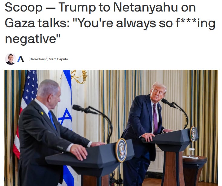 Sinceramente, non credo affatto ai rimproveri che Trump starebbe facendo a Netanyahu. Il primo si impegnerebbe per la pace, il secondo non ci crederebbe troppo.