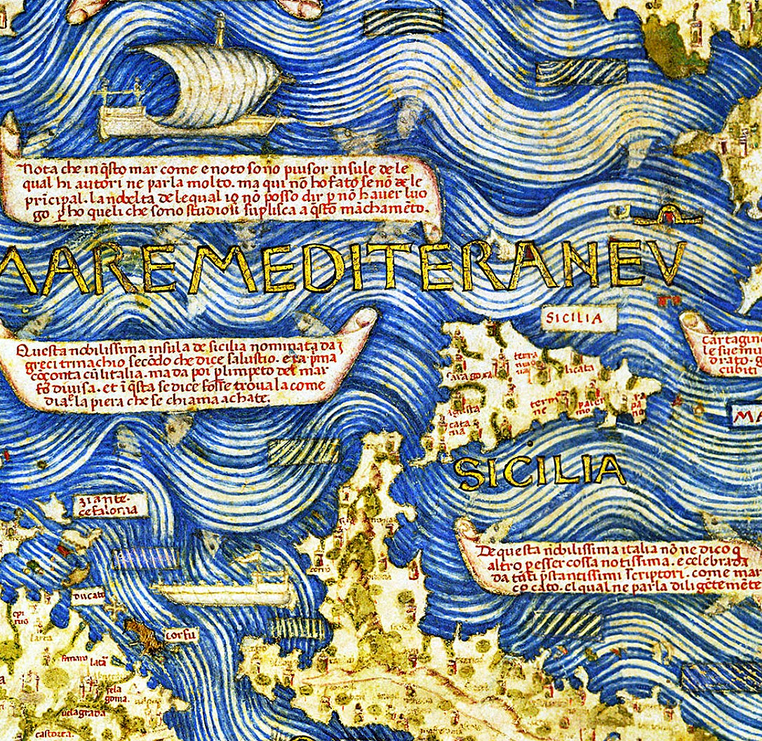 Il disegno cartografico (con il Sud in alto) è composto di pergamene incollate su legno, ed è corredato da quasi 3000 iscrizioni: nomi e note esplicative di carattere storico-culturale e geografico. Sono ancora legibilissime, e scritte in italiano. Una guida, insomma: globale. Siamo però prima (1450) dell'arrivo di Colombo in America. C'è Gaza (la trovate?) ma mica c'è New York.